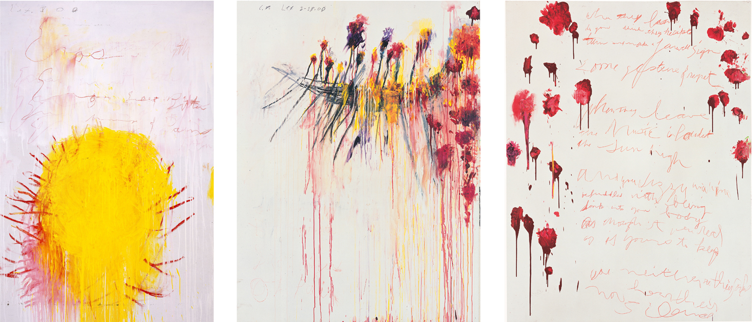 خطوط ناخوانا در نقاشیهای آبسترهی "تومبلی" با رنگ و روغن و مداد و پاستل و رنگهای محدود کار شدهاند.