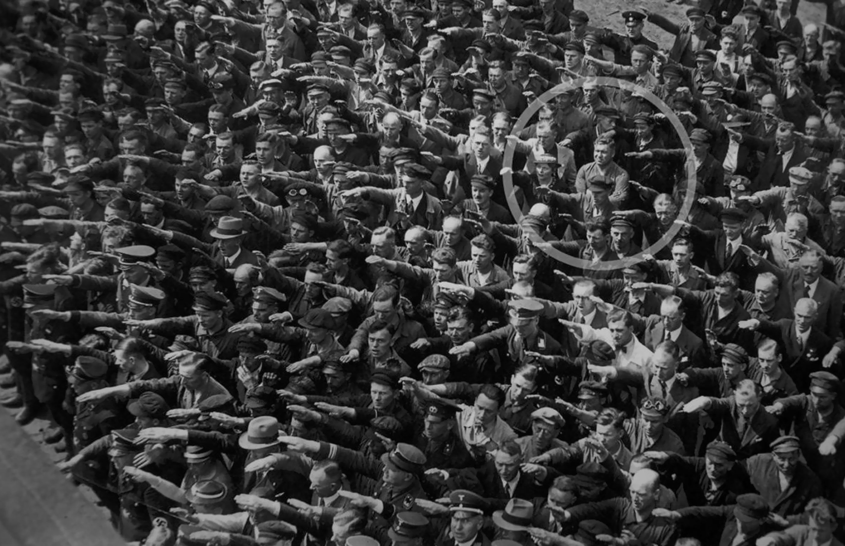 تصویر مردی که در میان جمعیت حاضر نیست دستش برای ادای احترام به هیتلر بلند کند، نافرمانی مقتدارنه‌ای را به نمایش گذاشته است. قابل بیان نیست که چند نفر در این جمعیت از روی ترس عمل کرده‌اند و کاملا آگاه بوده‌اند که احترام نگذاشتن به هیتلر برابر با امضای گواهی مرگ آنها است.