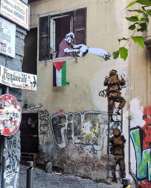 یکی از تازهترین نقاشیهایی که روی دیواری در شهر ناپل پدیدار شده، دو سرباز صهیونیست را هنگام بالا رفتن از دیوار یک خانه نشان میدهد. از آن بالا یک شهروند ناپلی که زنی خانهدار است دارد روی اشغالگران آب میریزد تا دورشان کند و نگذارد وارد حریم خانه شوند. کاستالدو میگوید: «آب ریختن روی مزاحمها کاری است مردم ناپل معمولا انجام میدهند. مثلا میخواهند به کودکانی که سر و صدا میکنند، میگویند بروند پی کارشان.»