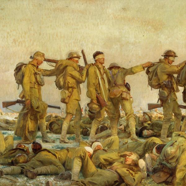 روایت نقاشان بزرگ از جنگ، نشان دادن رنج و خشونت است ، آنها زوال انسانیت را در قساوت جنگ به تصویر می کشند. جان سینگر سارجنت نقاش آمریکایی هم جنگ جهانی اول را در چنین قابی روایت کرده است: صفی از سربازان نابینا شده بر اثر گاز خردل، صفی از چشمان تاریک و جهانِ در سایه فرو رفته . بدن‌هایی که به خط شده اند: از عمق به سطح و از مغرب به مشرق. بدن‌هایی که گویا نقاش آن‌ها را تکثیر کرده تا در رنج و مرگ برابر باشند. برابری اینجا به صف شده است.