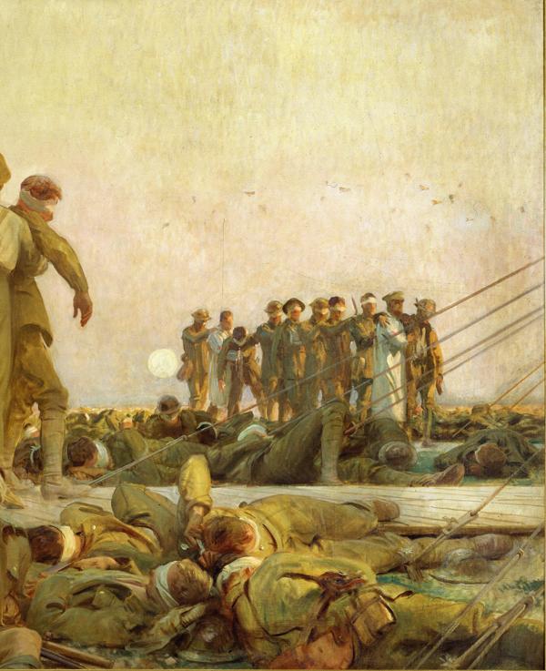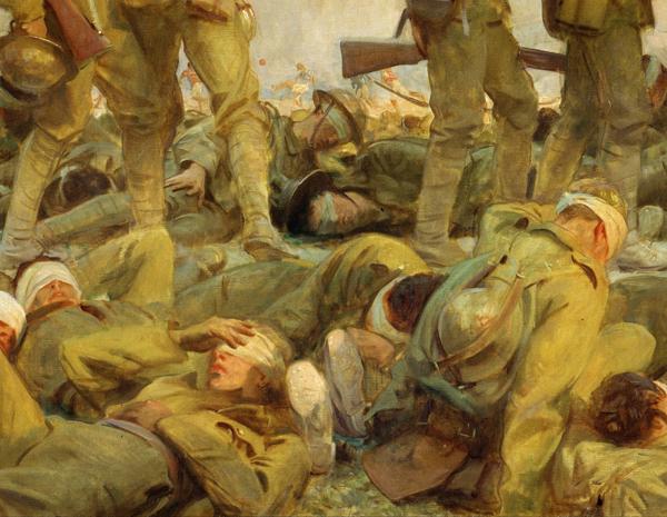 اما در تابلوی سارجنت درد و رنج بزرگ‌تری پنهان است. درد و زخمی که نقاش آن را پنهان کرده. شاید موضوع اصلی تابلوی سارجنت همین زخم پنهان است: به آن سربازان نگاه کنید همان‌ها که در عمق تابلو بی‌تفاوت به فاجعه سرگرم بازی هستند. سارجنت آنها را در سایه برده تا نشان دهد آنچه خشونت جنگ است نه این فیگورهای بر زمین غلطیده و آن چشمان از دست رفته که «فراموشی» است. آنچه جنگ را بازتولید می‌کند فراموشی است . عبور زمان و عادت است. در تابلوی سارجنت خشونت و رنج واقعی همین کنار آمدن با رنج است.